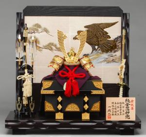 金箔押仕上げの高級な兜です。衝立屏風と松と鷹の絵が豪華さをより一層引き立てます。
